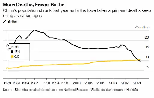 China's Population Starts Shrinking, First Drop Since 1960s. China's population started shrinking in 2022 for the first time in six decades, a milestone for the world's second-largest economy, which is facing an increasingly serious demographic crisis. China had 1.41 billion people at the end of last year… (Bloomberg)